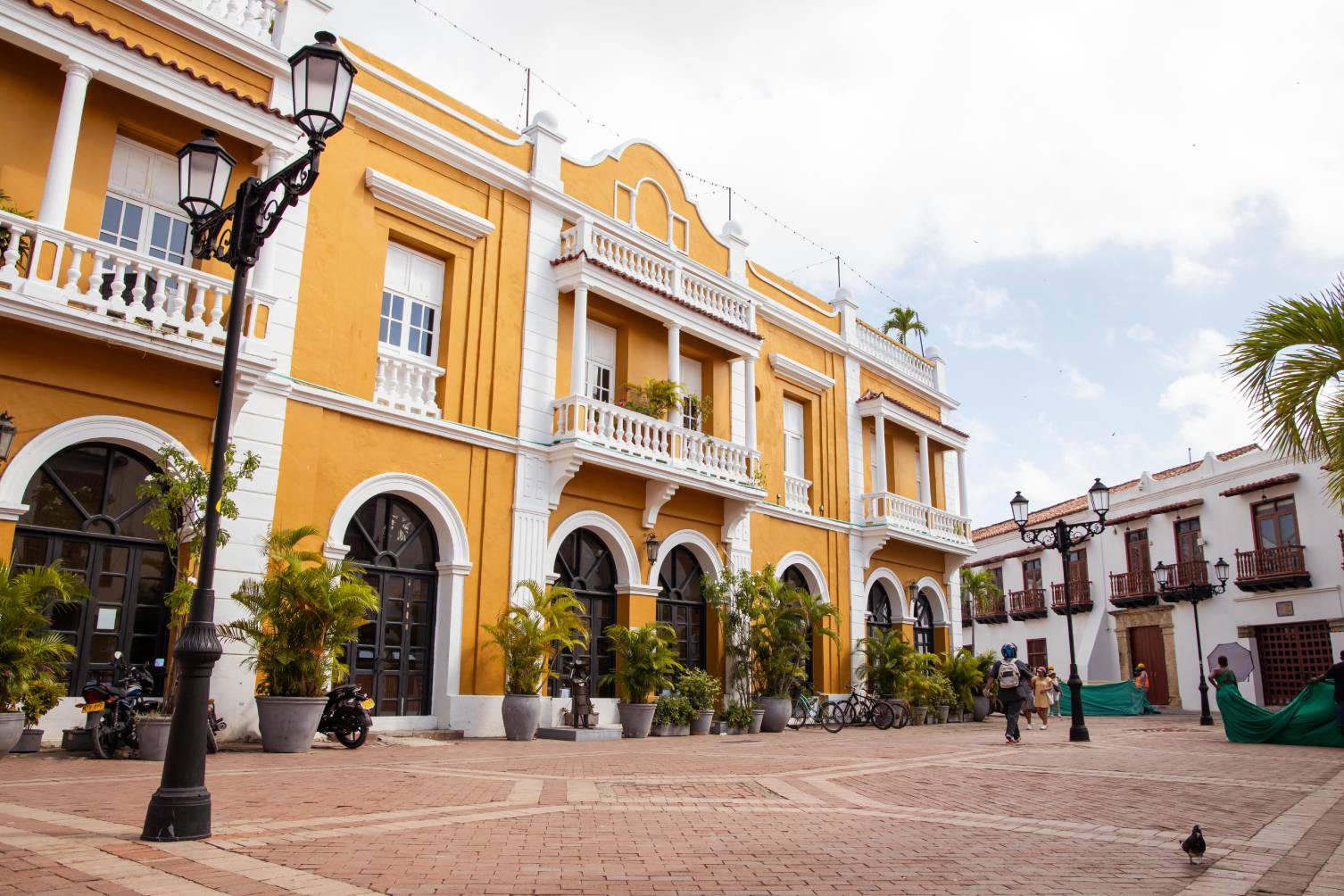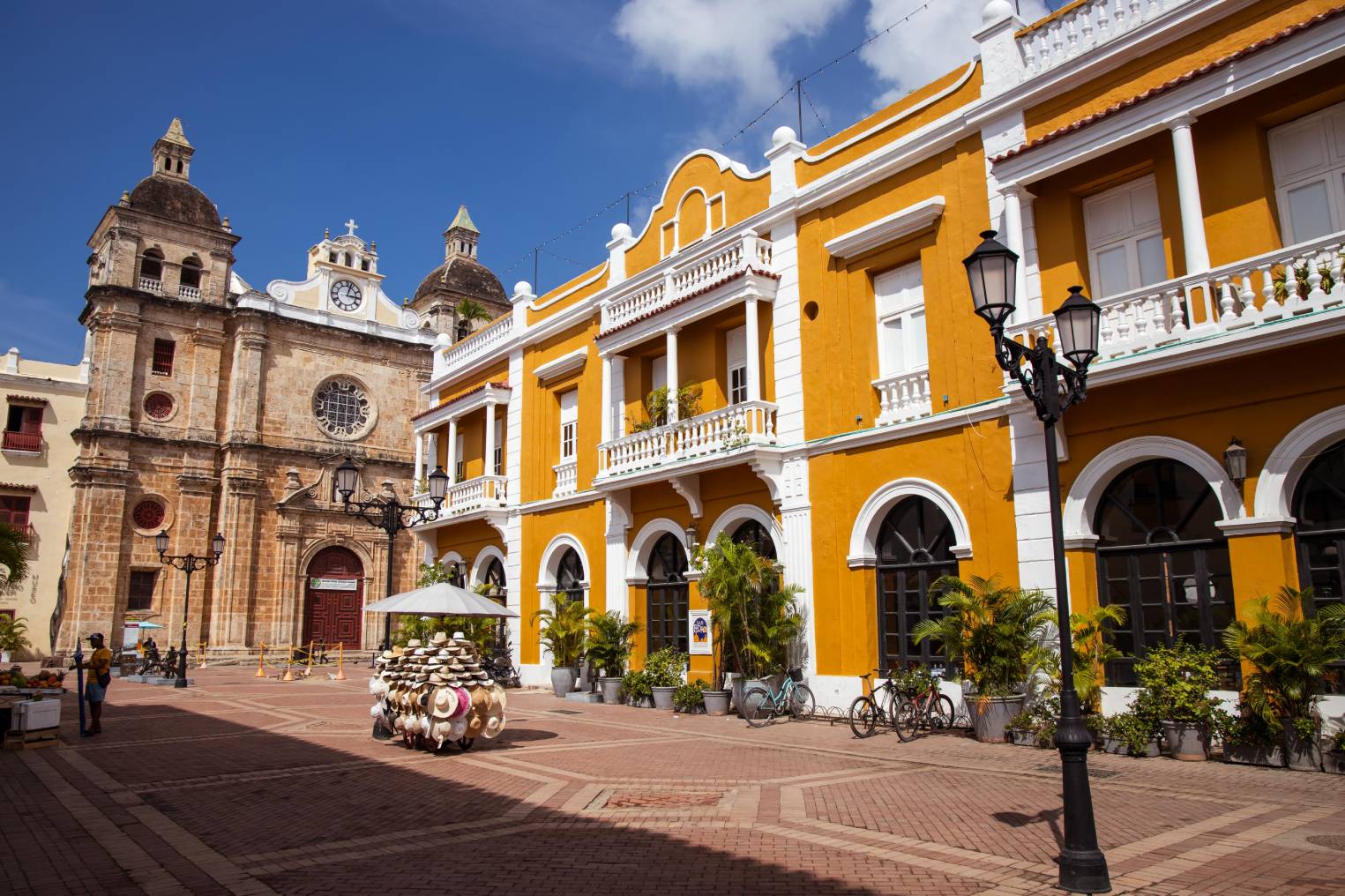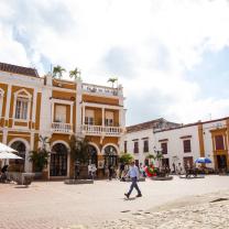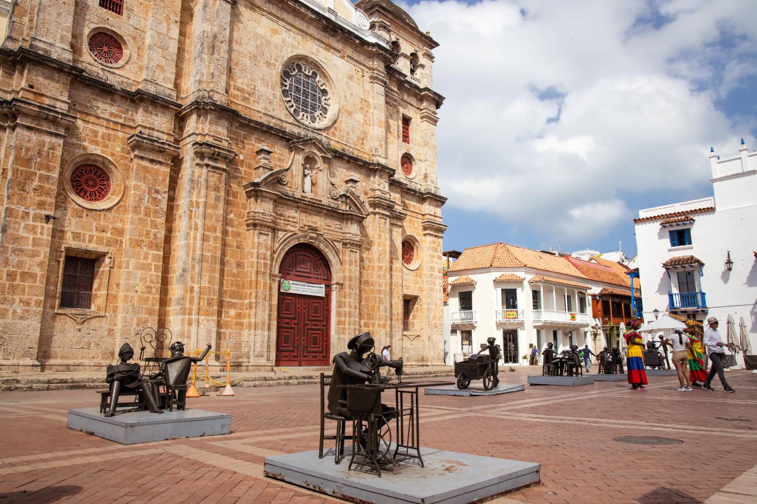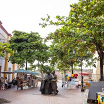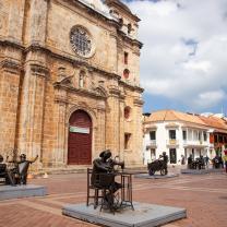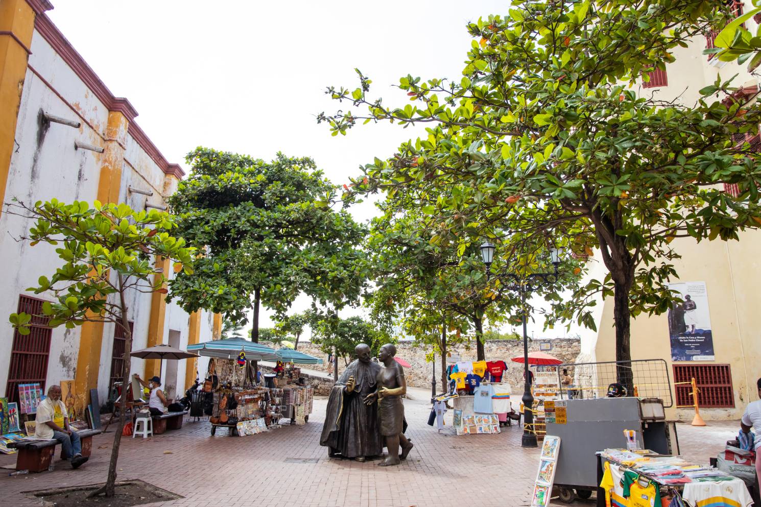 Plaza con estatua en bronce representando a San Pedro Claver caminando junto a un esclavo, obra de Enrique Grau. Toda la plaza y el callejón que la conecta con la Plaza de la Aduana, se caracteriza por sus particulares esculturas que representan la vida y cotidianeidad cartagenera a través de diversos oficios y profesiones hechas en chatarra por Edgardo Carmona.